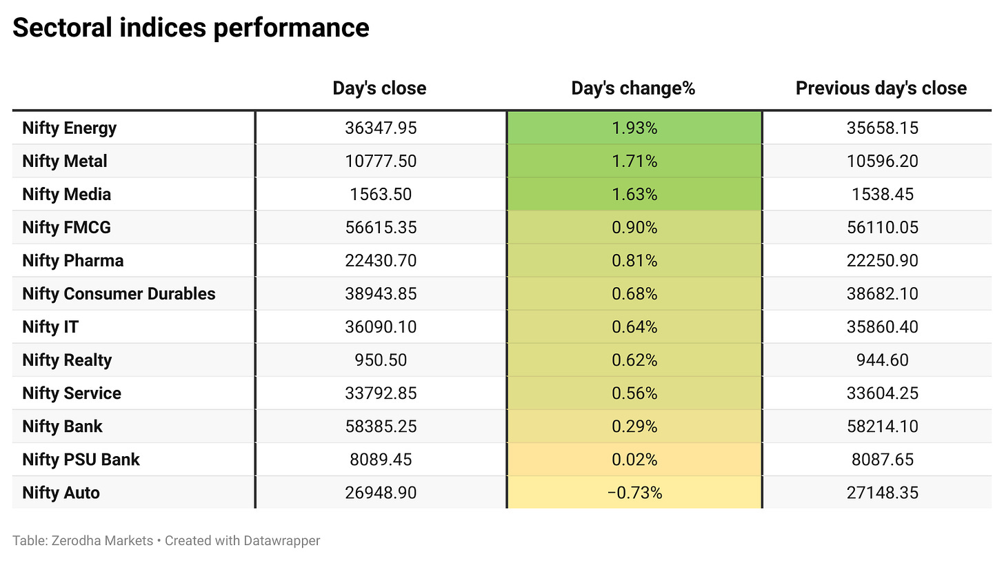 Nifty Energy was the top gainer, rising 1.93%, while Nifty Auto was the only sector to close in the red, slipping 0.73%. Out of the 12 sectoral indices, 11 ended in the green and only 1 closed lower, indicating strong broad-based buying across sectors.