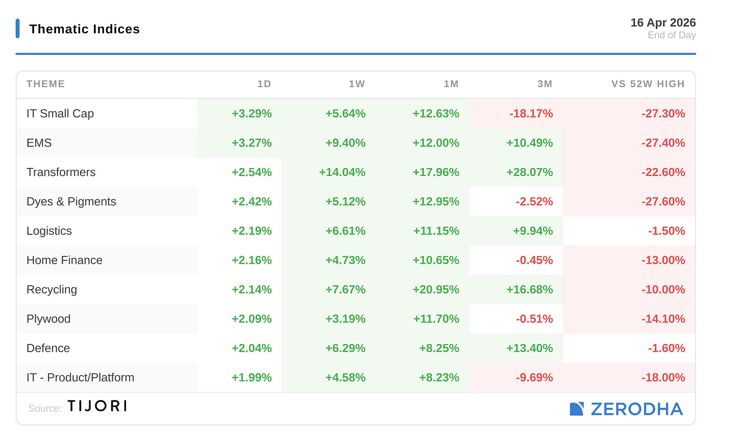 Tijori is an investment research platform that has constructed niche indices for various themes and sub-sectors. They help you understand the market performance of narrow slices of the market. You can also track the Promoter buying and other interesting stuff, like Capex activity by the companies in the Tijori App’s idea dashboard
