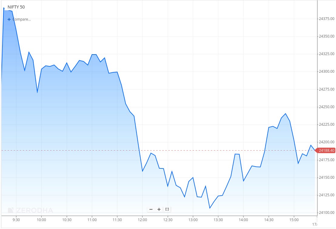 After trading largely range-bound until 11:30 AM, Nifty gradually drifted lower and broke below the 24,200 mark. Selling intensified around noon, dragging the index sharply to the day’s low near the 24,100 zone by 1:30 PM.