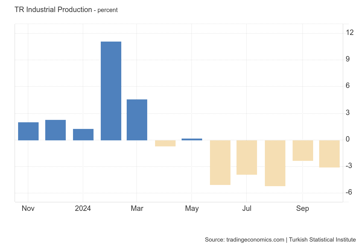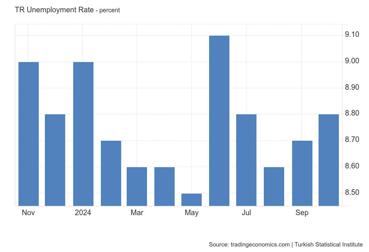 Turkey's industrial production fell by 3.1% year-on-year in October 2024, worsened from a 2.3% decline in September. Mining and manufacturing output continued to decline, while electricity, gas, steam, and air-conditioning supply increased by 7.6%. Monthly, industrial production dropped by 0.9%, following a 1.6% gain in September. Meanwhile, Turkey's seasonally adjusted jobless rate rose to 8.8% in October 2024, from 8.7% in September, the highest rate since July. Unemployment increased by 61,000 to 3.2 million, while employment grew by 156,000 to 32.97 million, pushing the employment rate to 49.9%. Dive deeper