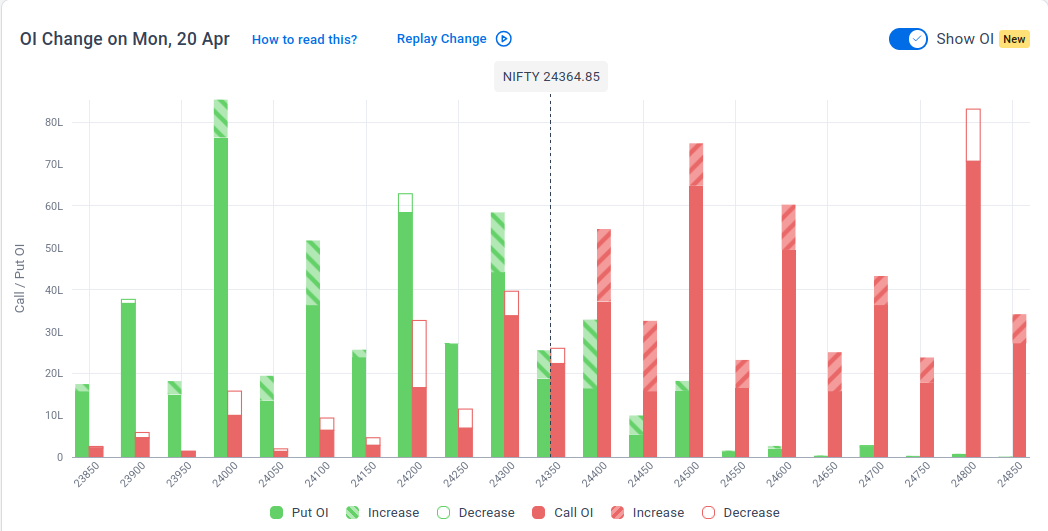 The maximum Put Open Interest (OI) is observed at 24,000, followed by 24,300 & 24,200, suggesting support at 24,200-24,100.