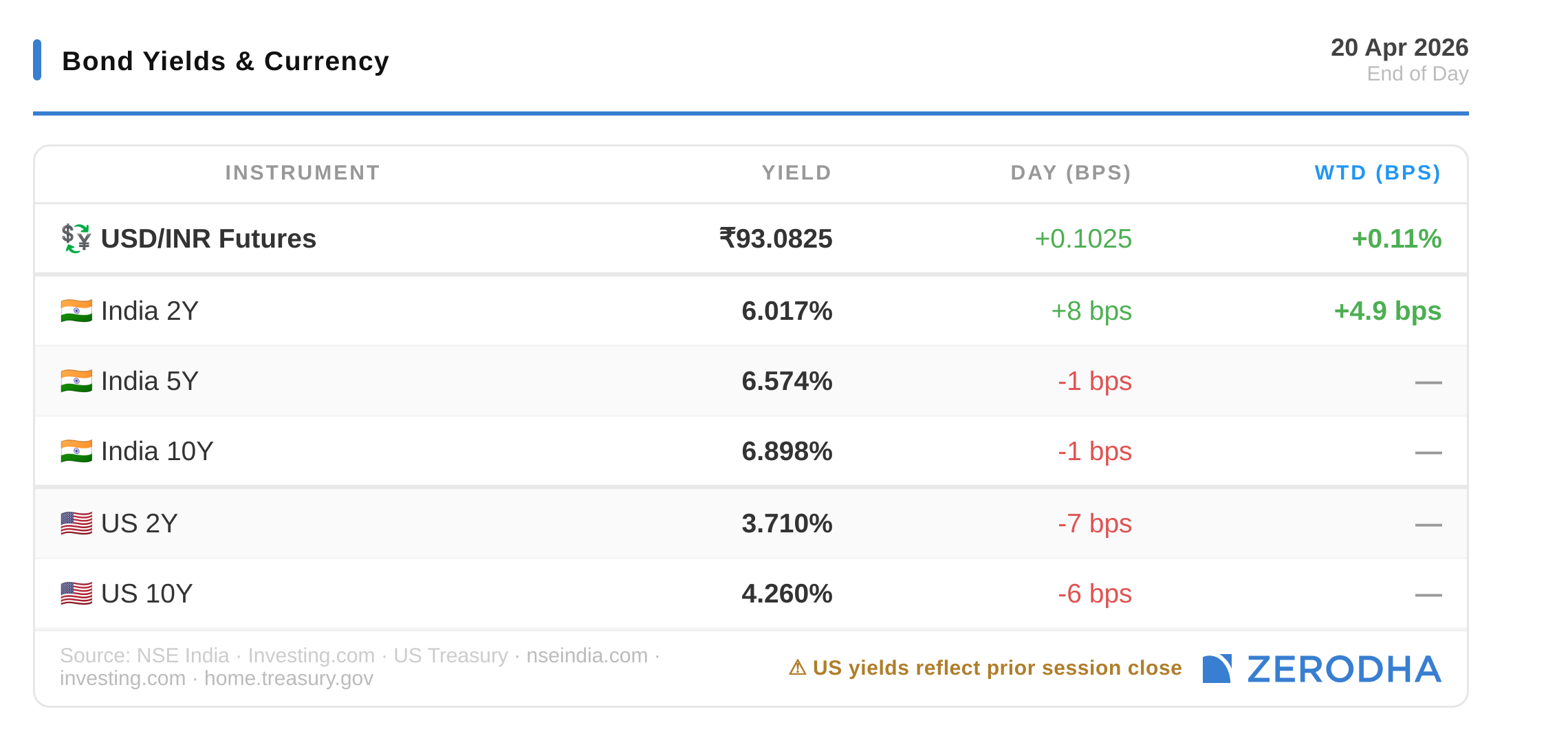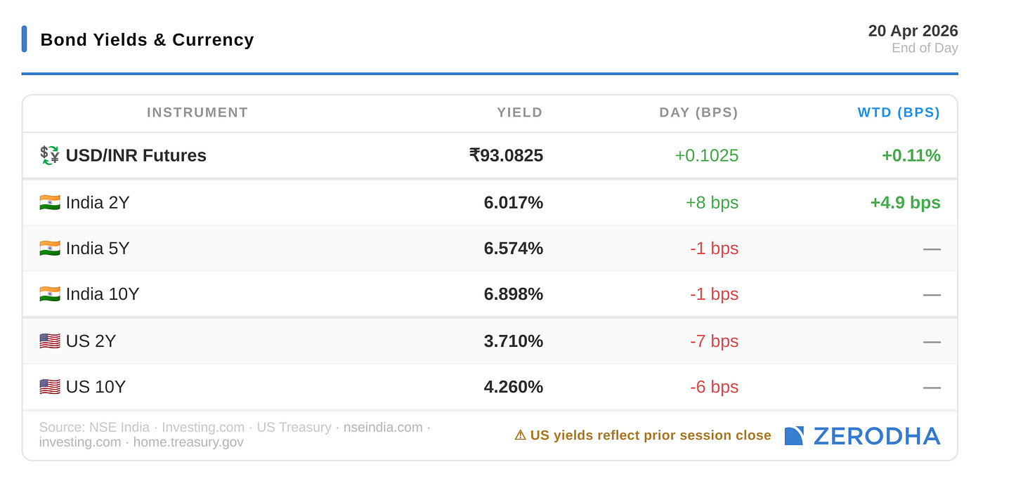 India 10Y yield at 6.898%. US 10Y yield held at 4.26%. Rupee weakened slightly to 93.08 per dollar, up 0.11%. Bond markets calm despite crude volatility.