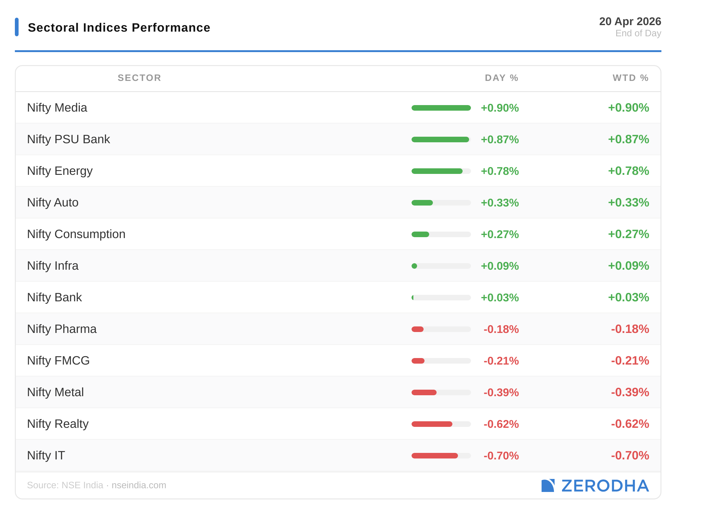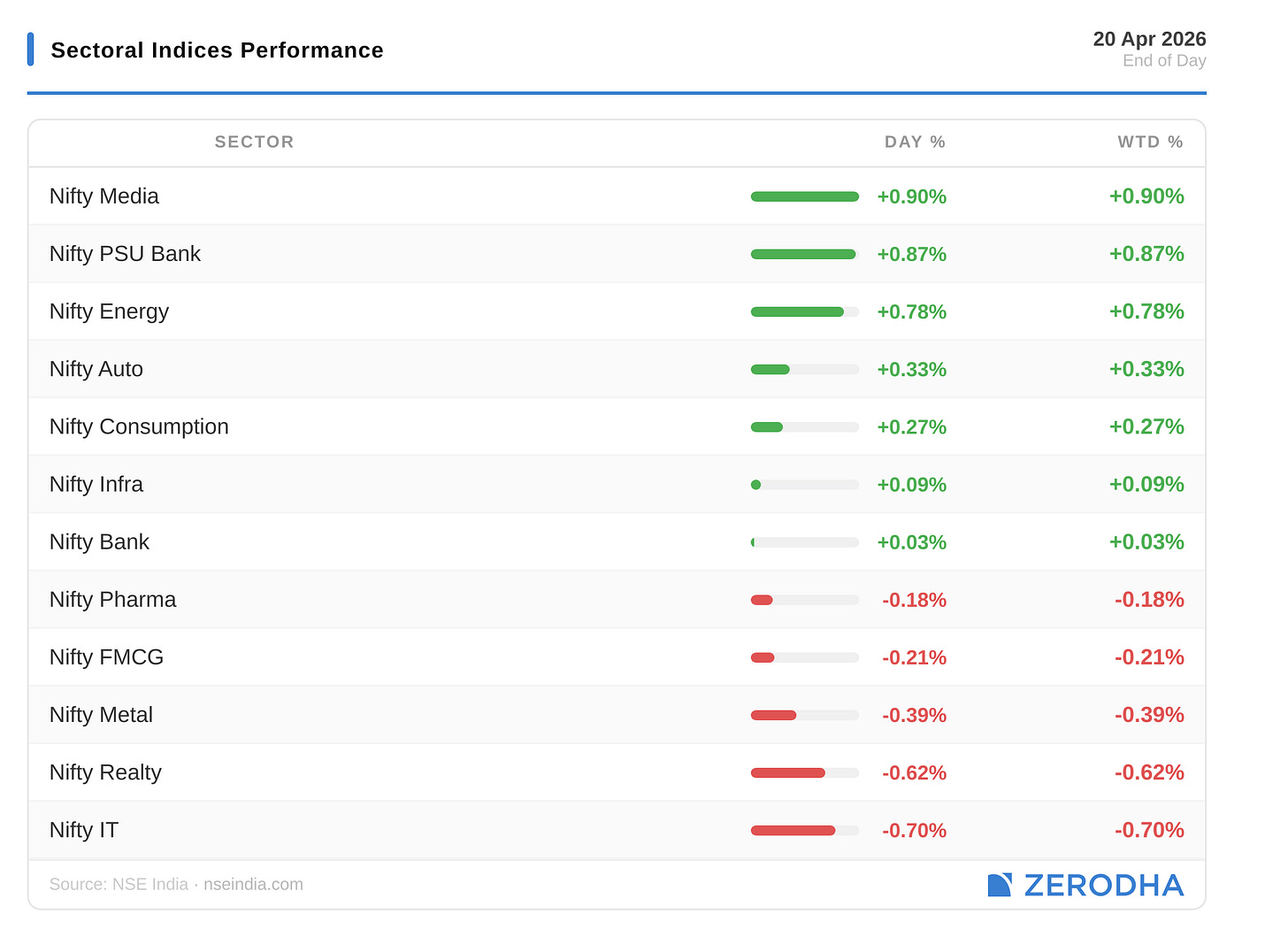 Media led with 0.9%, PSU Bank added 0.87%, Energy climbed 0.78% on crude’s 6.25% surge, and Auto ticked up 0.33%. IT fell 0.7%, Realty dropped 0.62%, Metals shed 0.39%. Seven of twelve sectors closed green, but index gains masked weak internals.