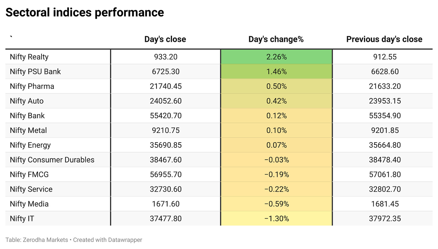 Nifty Realty emerged as the top gainer, closing 2.26% higher at 933.20, while Nifty IT was the worst performer, declining 1.30% to close at 37,477.80. Out of the 12 sectors listed, 7 closed in the green, indicating a broadly positive market sentiment, while 5 ended in the red, reflecting a mixed performance across various segments.