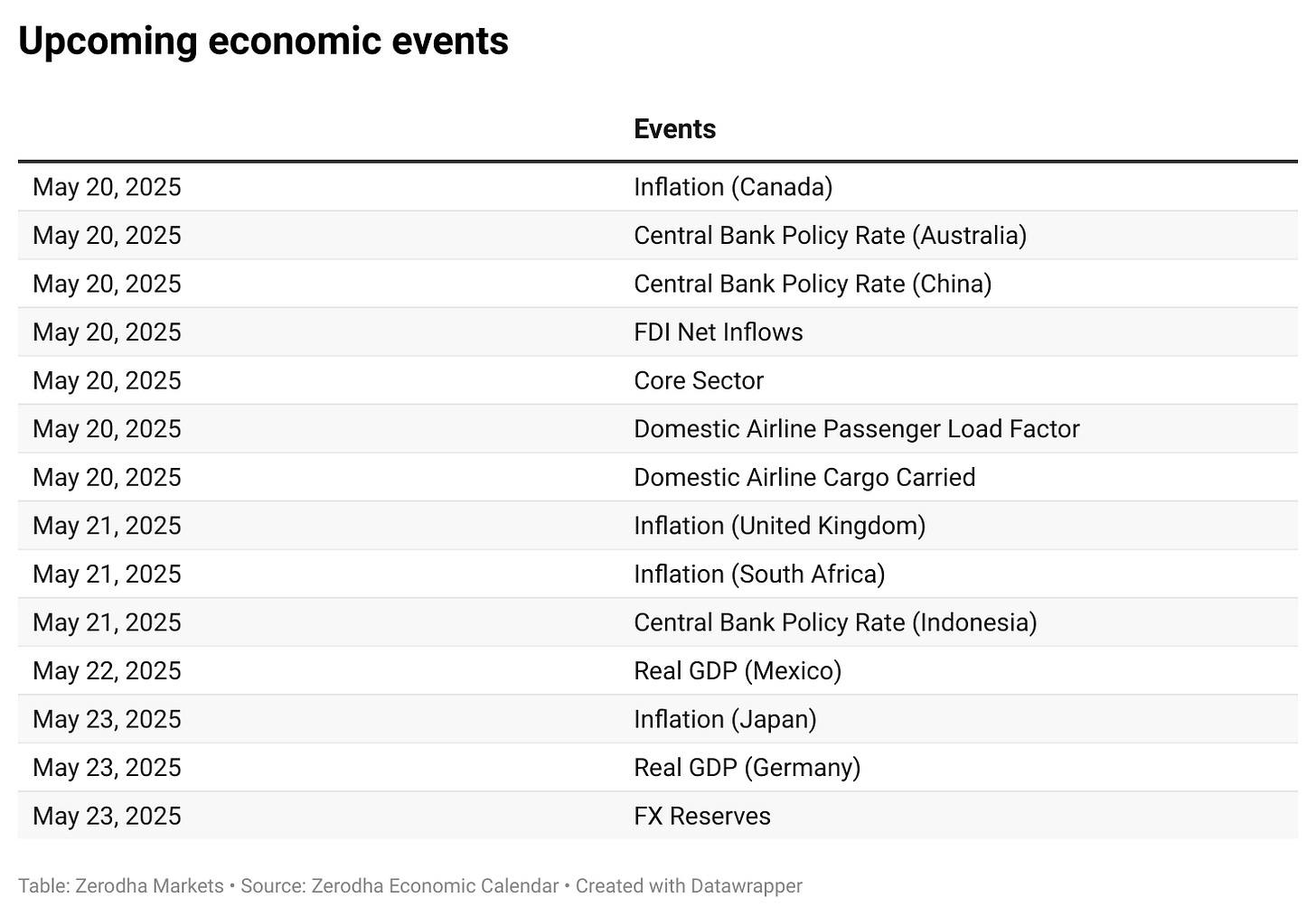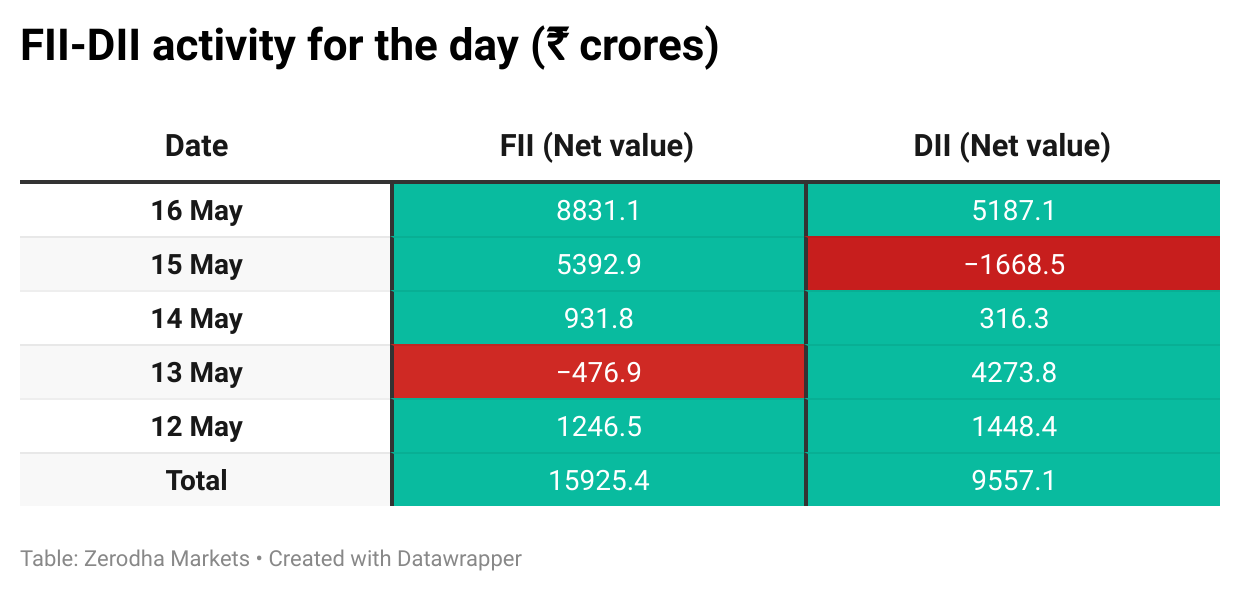 Today's slightly weaker sentiment can be attributed to Moody's downgrade of U.S. credit, which weighed on U.S. futures. However, market sentiment found some support from FII inflows and a weaker dollar, despite lingering geopolitical risks following India's Operation Sindoor. Investors are now awaiting updates on the India-U.S. trade deal and Piyush Goyal's upcoming visit to Washington, while the ongoing earnings season remains a critical factor for near-term market direction.