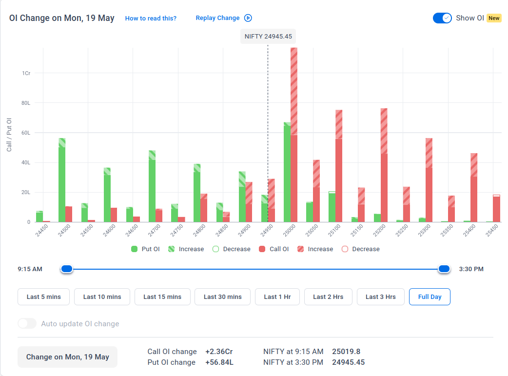 The maximum Call Open Interest (OI) is observed at 25,000, followed closely by 25,200, indicating strong resistance at 25,200 to 25,400 levels.