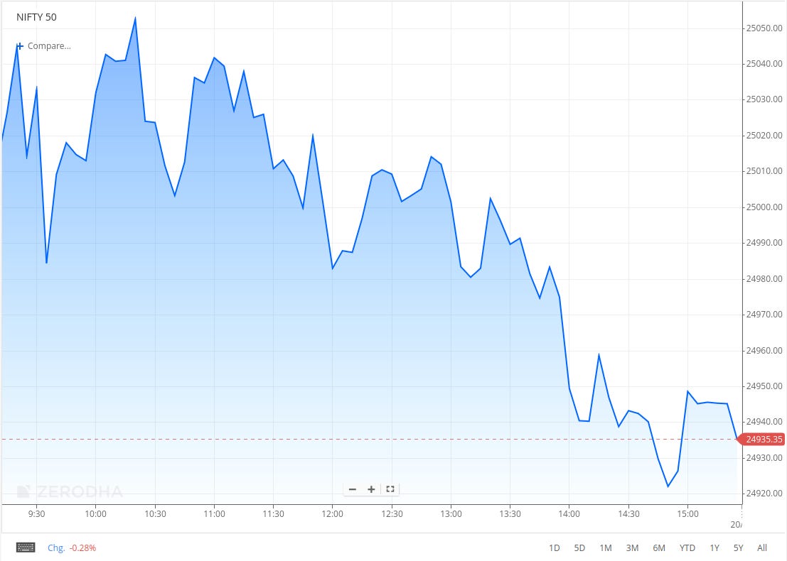 Nifty opened flat at 25,005.35 and traded with a bearish bias, quickly testing 24,950 within the first 20 minutes. The index then recovered to test 25,050 within the first hour before consolidating in a narrow range between 24,980 and 25,030 until 2 PM. However, it later sold off, breaking the day's low and consolidating at lower levels before eventually closing at 24,945.45, down by 0.29%.