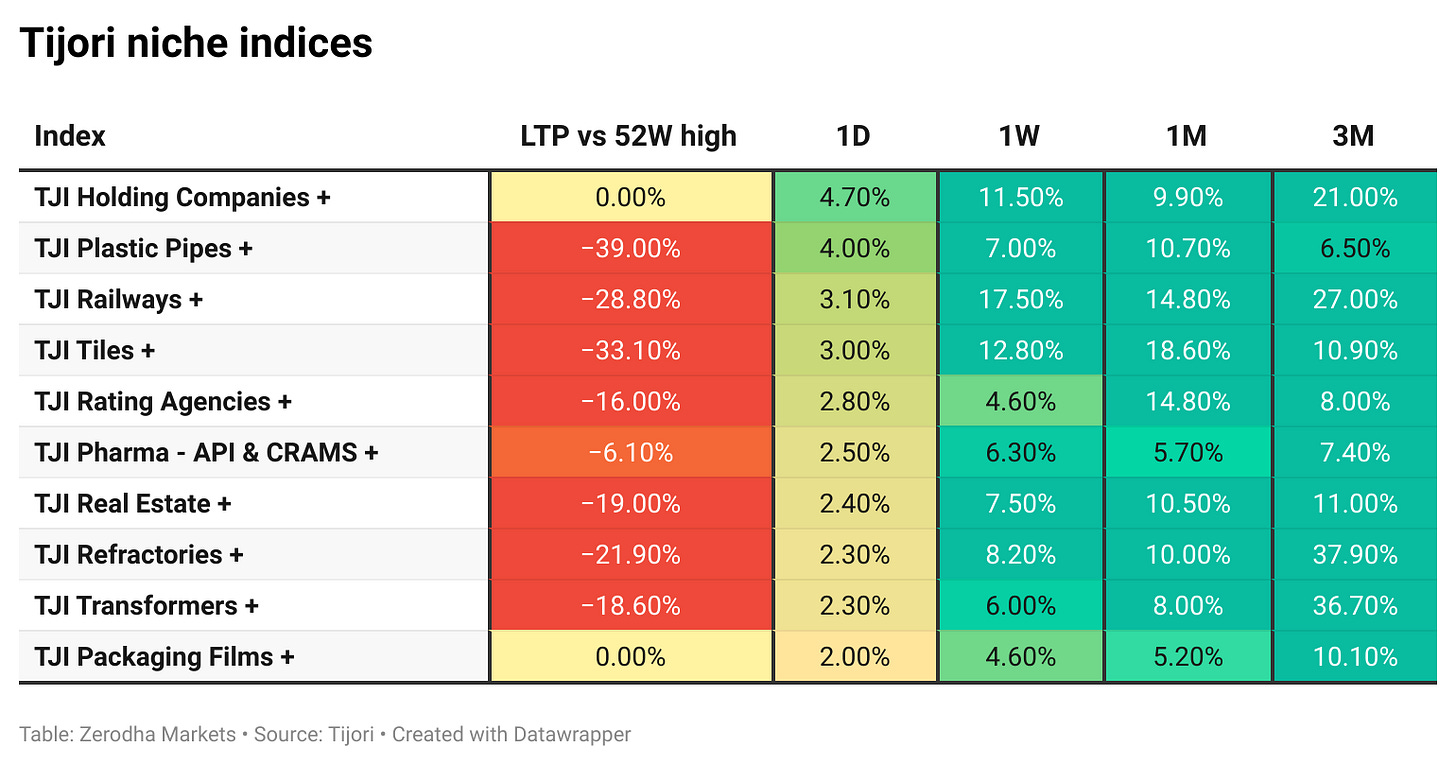 Tijori is an investment research platform, and they have constructed niche indices for various themes and sub-sectors. They help you understand the market performance of narrow slices of the market. You can also track the Promoter buying and other interesting stuff like Capex activity by the companies in the Tijori App’s idea dashboard