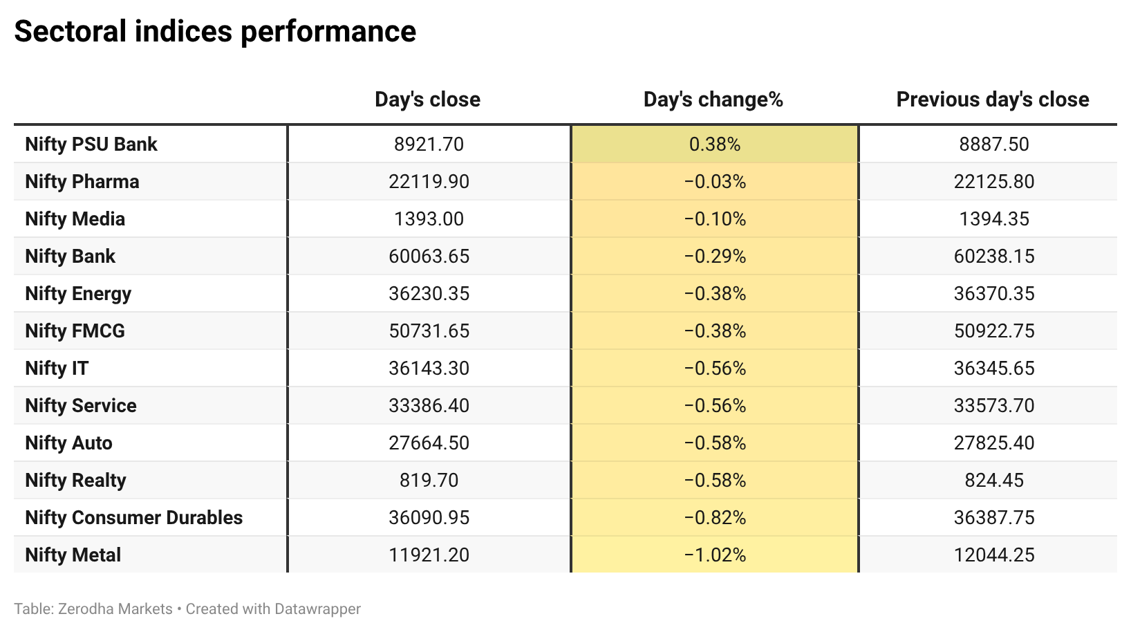 Nifty PSU Bank was the top gainer of the day with a modest gain of 0.38%, while Nifty Metal was the worst performer, falling 1.02%. Out of the 12 sectoral indices tracked, only 1 closed in the green, while 11 ended in the red, indicating broad-based selling across sectors.
