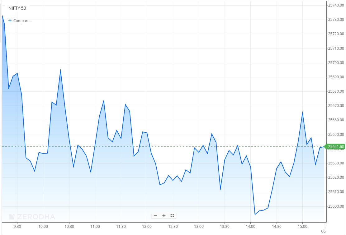 In the second half, weakness intensified briefly post 2 PM as Nifty slipped to intraday lows near the 25,580 zone. A recovery attempt followed in the final hour, helping the index reclaim the 25,650 zone. Nifty eventually closed near 25,642.80, ending marginally lower, reflecting a volatile, two-sided session marked by intraday swings and consolidation.