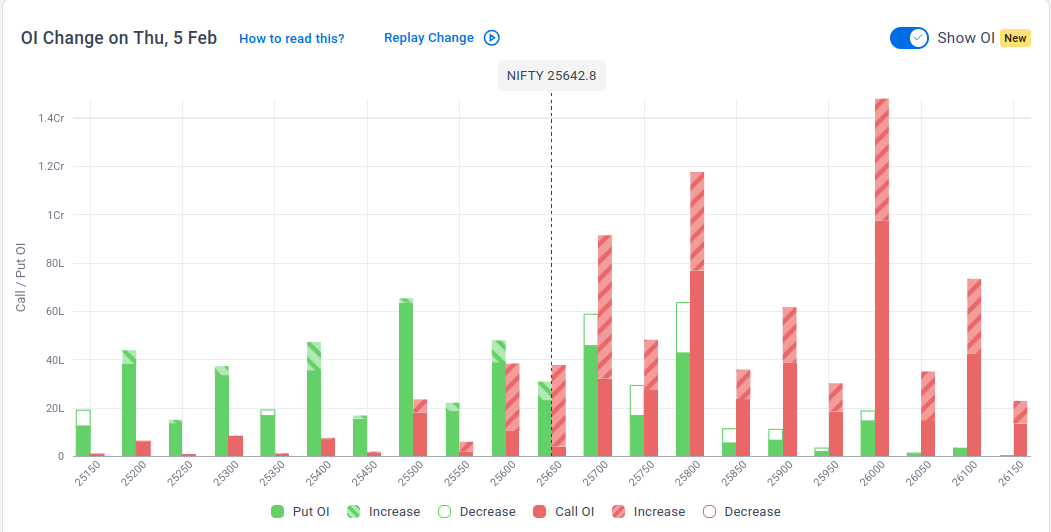The maximum Put Open Interest (OI) is observed at 25,500, followed by 25,700 & 25,800, suggesting support at 25,600-25,500.