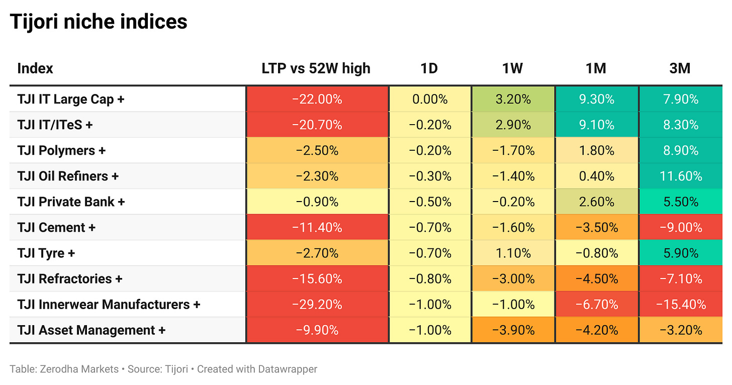 Tijori is an investment research platform, and they have constructed niche indices for various themes and sub-sectors. They help you understand the market performance of narrow slices of the market. You can also track the Promoter buying and other interesting stuff, like Capex activity by the companies in the Tijori App’s idea dashboard