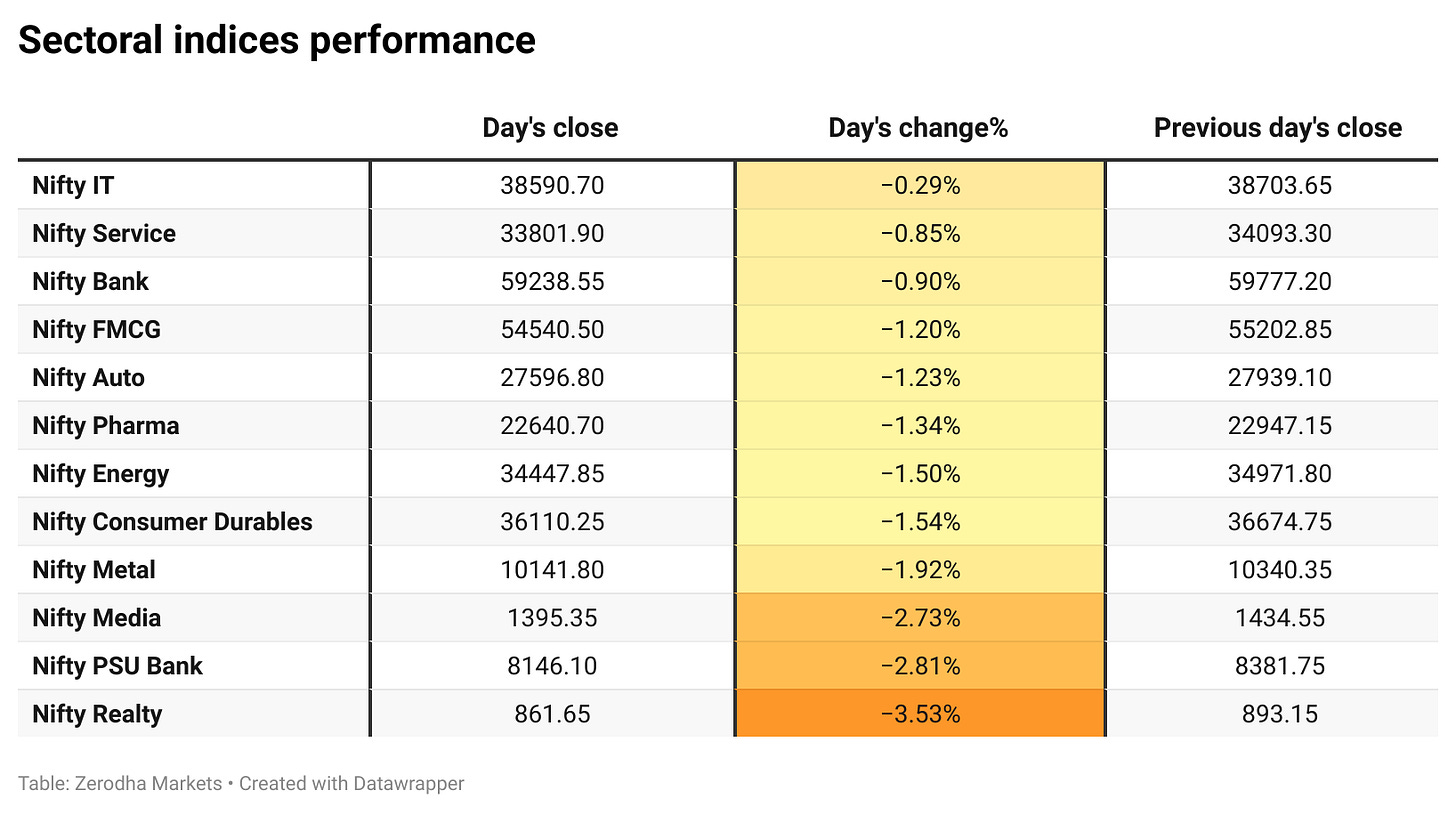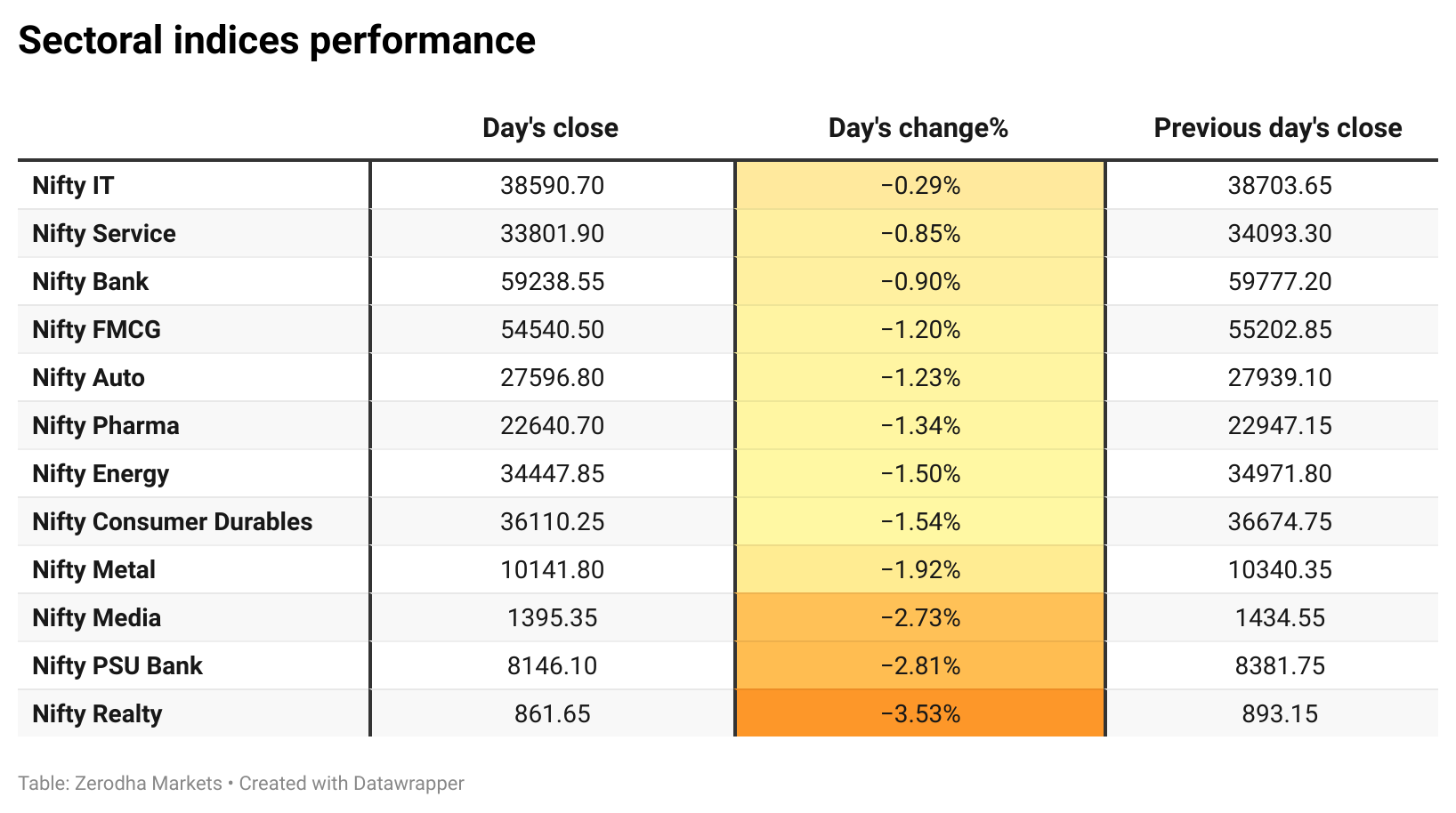 Nifty IT was the least negative sector with a minor dip of -0.29%, while Nifty Realty was the worst performer, plunging -3.53%. All 12 sectoral indices closed in the red today, reflecting broad-based weakness across the market.