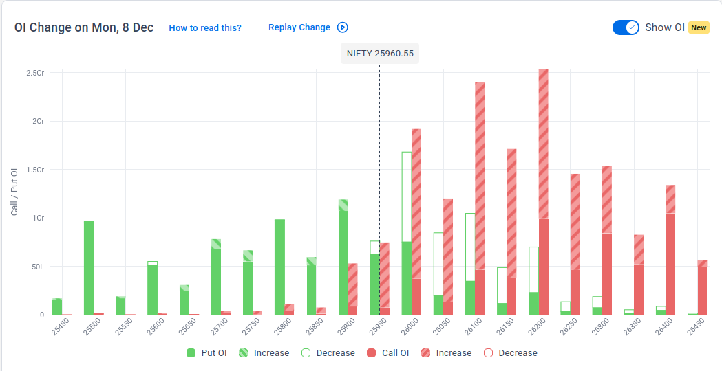 The maximum Call Open Interest (OI) is observed at 26,200, followed by 26,100, indicating potential resistance at the 26,100 -26,200 levels.