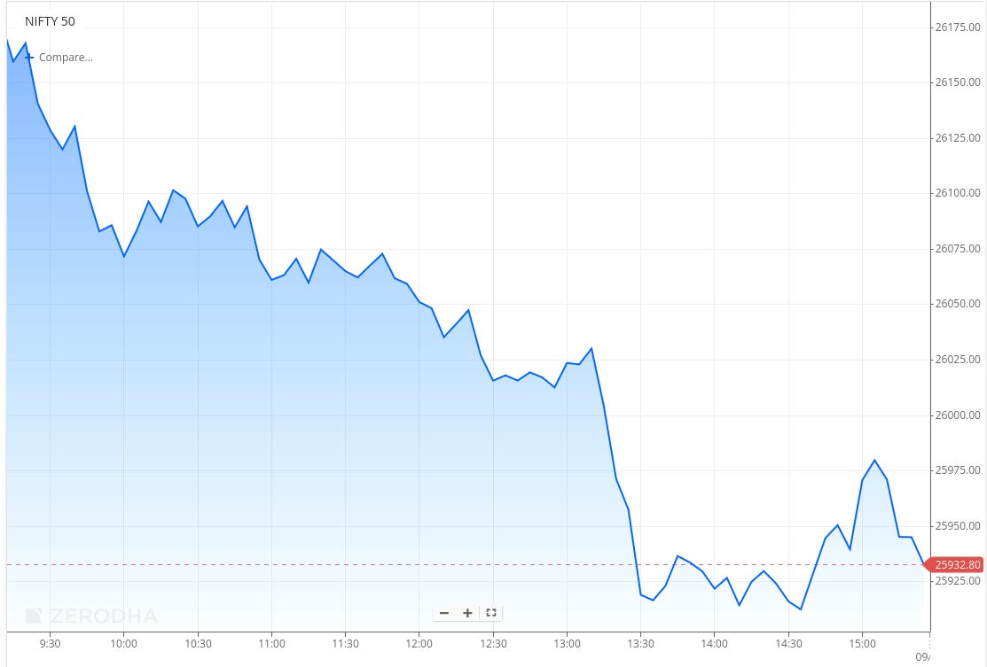 Overall, it was a weak, one-way downtrend through the session with sellers firmly in control, closing Nifty well below the psychological 26,000 mark. Weakness was even more pronounced in mid and small caps, which slipped nearly 2%.