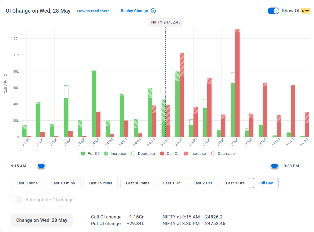 The maximum Put Open Interest (OI) is observed at 24,500, followed closely by 24,800, suggesting strong support at 24,600 to 24,500 levels.