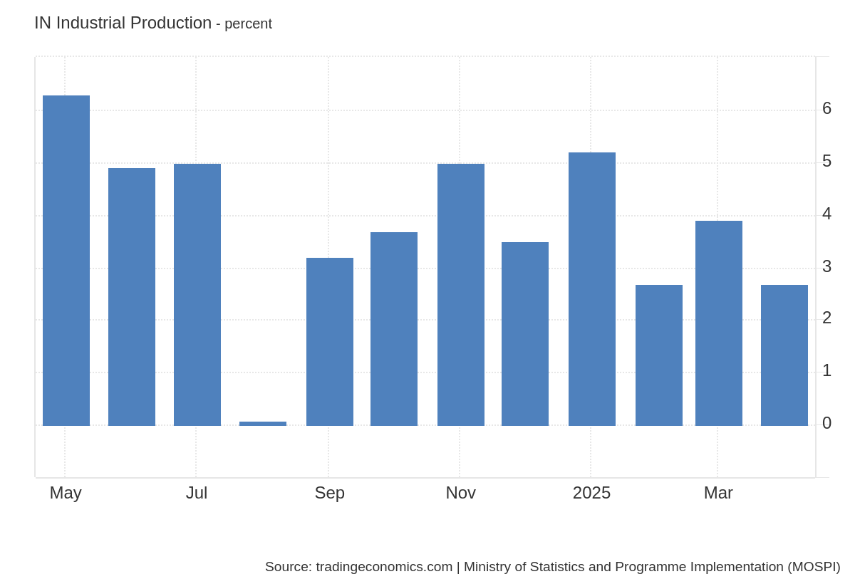 India’s industrial output rose 2.7% YoY in April, easing from 3.9% in March but beating forecasts. Manufacturing grew 3.4%, while electricity slowed and mining declined. Gains in electronics and autos offset pharma and chemical dips. Dive deeper