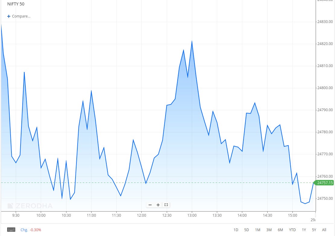 Nifty opened flat at 24,832.50 and touched the day’s high of 24,864.25 within the first 15 minutes. However, it quickly slipped by 100 points and remained in a narrow 50-point range between 24,750 and 24,800 through the first half. In the second half, apart from a brief spike to 24,820, the index stayed rangebound between 24,750 and 24,790, eventually closing at 24,752.45, down by 0.30%.