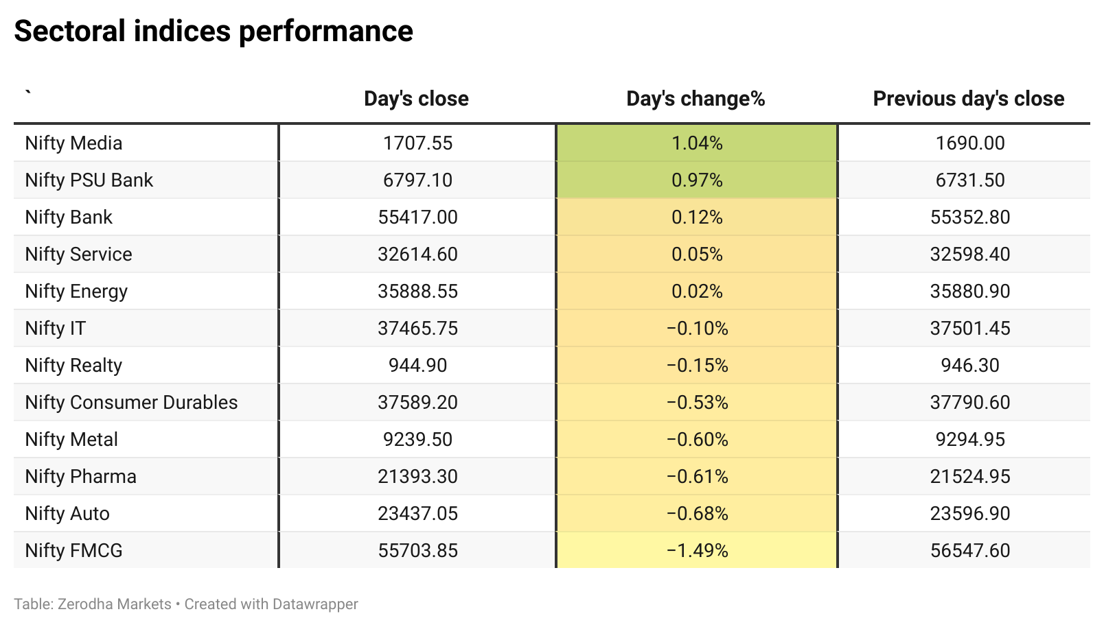 Nifty Media was the top gaining sector, rising by 1.04%, while Nifty FMCG was the top loser, slipping by 1.49%. Out of the 12 sectors listed, 5 sectors ended in the green and 7 sectors closed in the red.