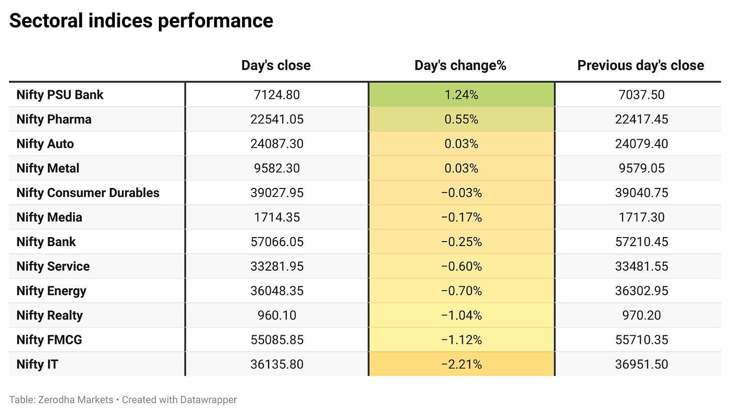 The top-gaining sector for the day was Nifty PSU Bank, which rose by 1.24%, while the top losing sector was Nifty IT, declining by 2.21%. Out of the 13 sectoral indices, 4 sectors closed in the green, while 8 sectors ended in the red, indicating a largely negative breadth despite gains in select pockets like PSU banks and pharma.