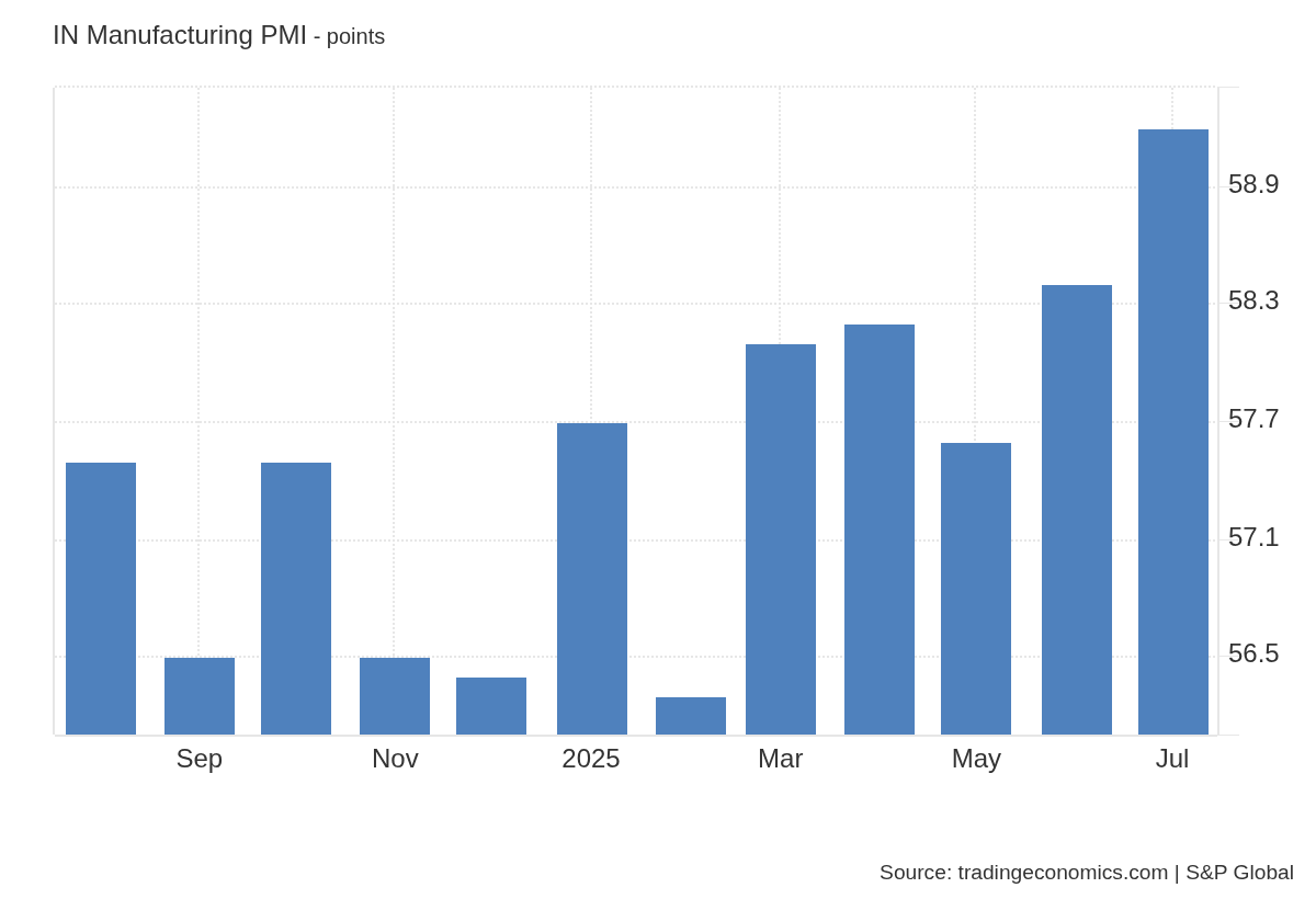 India’s Manufacturing PMI rose to 59.2 in July 2025, the highest in over 17 years, indicating strong sector momentum. Output and new orders surged, though export growth eased slightly. Purchasing activity jumped, input stocks rose, and charge inflation accelerated amid robust demand. Dive deeper