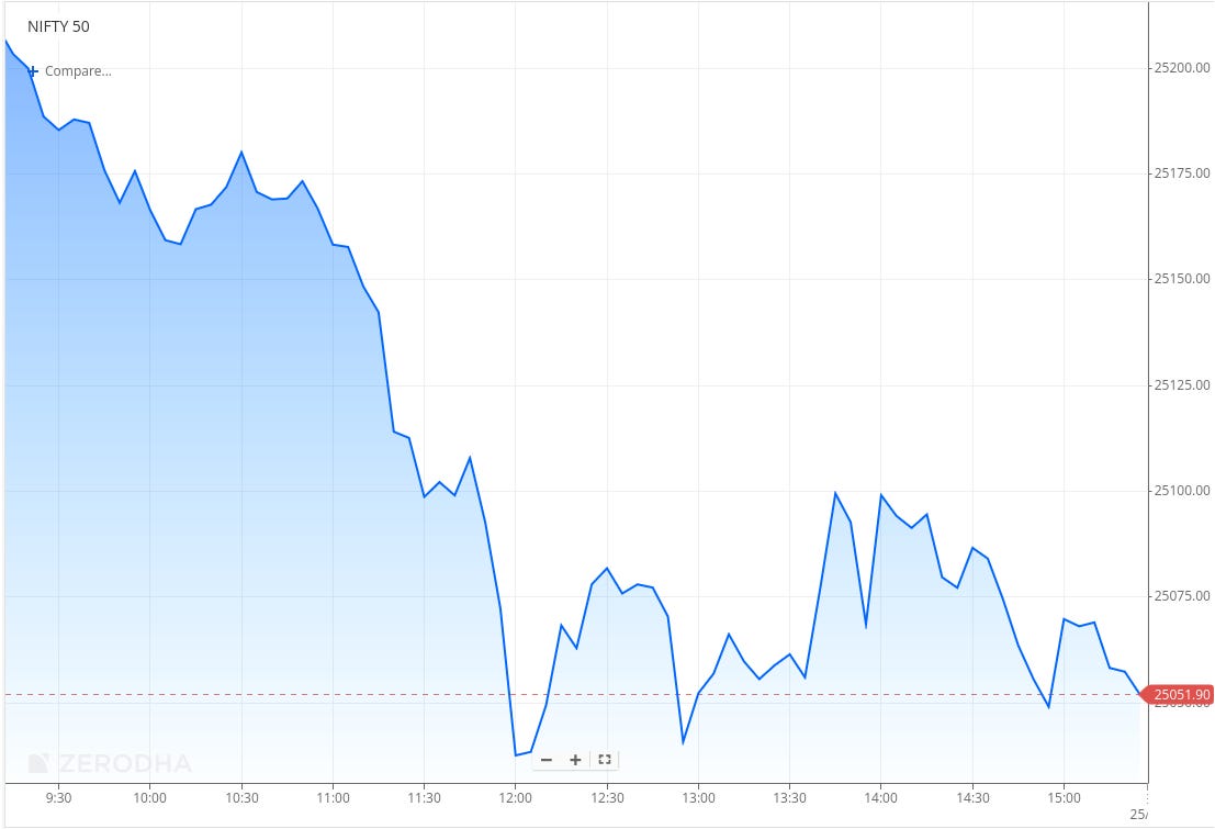 Nifty 50 opened with a 25-point gap-up at 25,243.30 but dropped nearly 100 points in the first hour, testing the 25,150 level. The decline continued after the first hour, with the index falling further to 25,020, a total drop of about 220 points from the day’s high. In the second half, Nifty moved sideways within a narrow range of 25,070 to 25,104 and eventually closed at 25,051.90, down 0.63%.