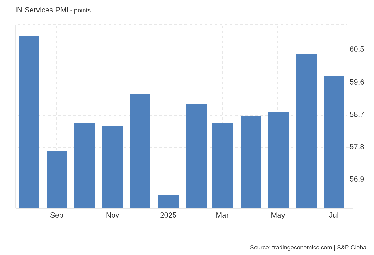 India’s Services PMI eased to 59.8 in July 2025 from 60.4, reflecting a slight slowdown from June’s 10-month high. New orders and foreign sales remained strong, while job creation moderated. Input and output inflation accelerated, with output price inflation above trend. Dive deeper