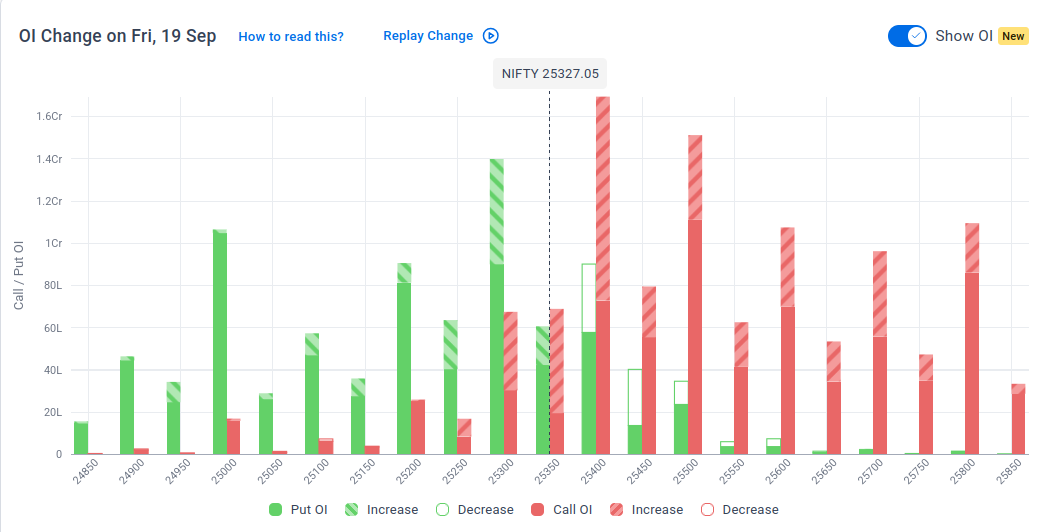 The maximum Put Open Interest (OI) is observed at 25,300, followed by 25,000, suggesting strong support at 25,300 to 25,200 levels.