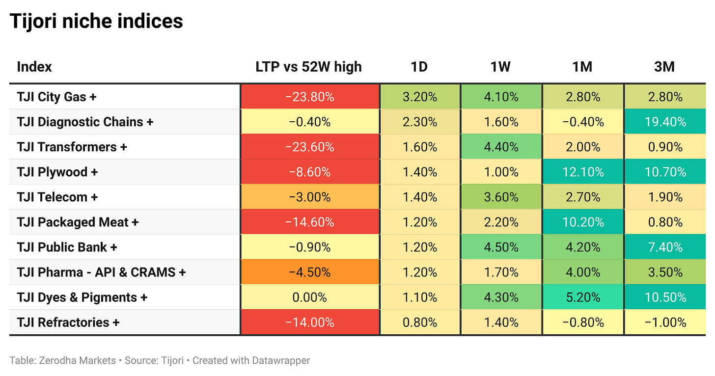 Tijori is an investment research platform, and they have constructed niche indices for various themes and sub-sectors. They help you understand the market performance of narrow slices of the market. You can also track the Promoter buying and other interesting stuff like Capex activity by the companies in the Tijori App’s idea dashboard