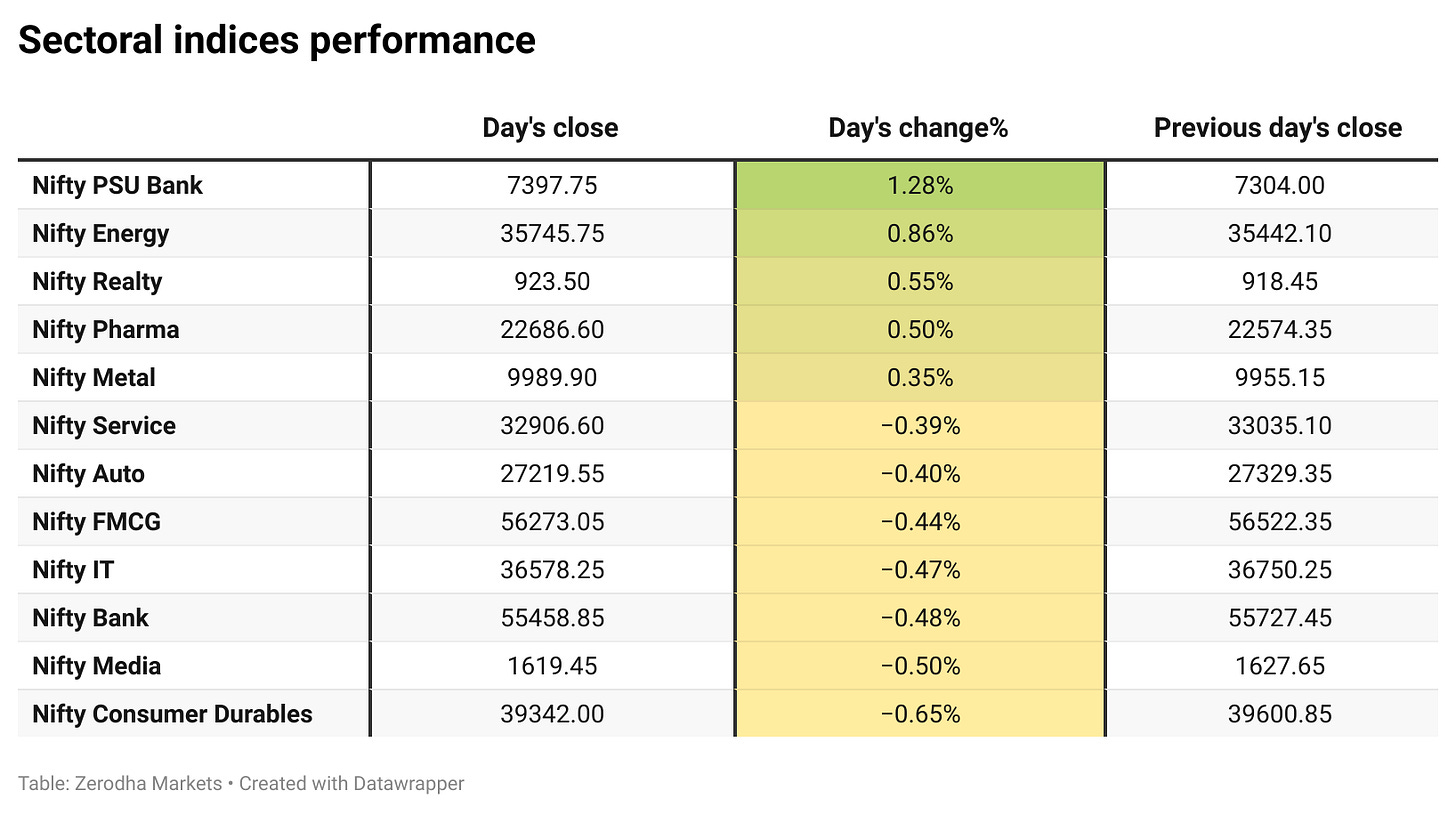 The top gainer for the day was Nifty PSU Bank, rising 1.28%, while the top loser was Nifty Consumer Durables, which fell 0.65%. Out of the 12 sectoral indices,5 closed in the green and 7 ended in the red, indicating a mixed but slightly negative market breadth.