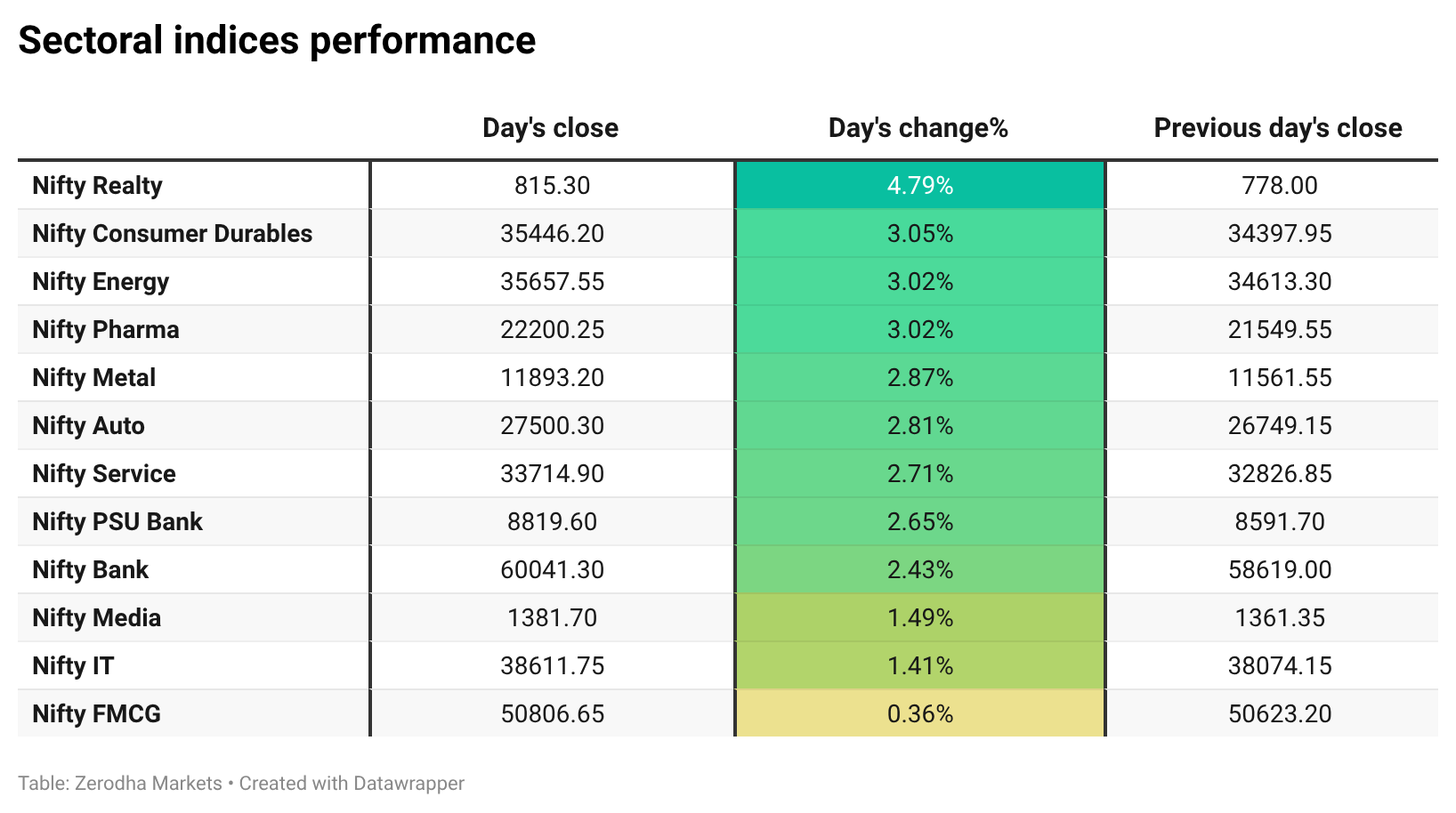 Nifty Realty was the top gainer today, surging 4.79%, while Nifty FMCG posted the smallest gain at just 0.36%. All 12 sectoral indices ended in the green, with none closing in the red — marking a broad-based rally across the board.