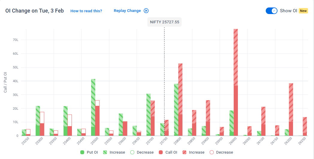 The maximum Put Open Interest (OI) is observed at 25,500, followed by 25,800, suggesting support at 25,600-25,500.