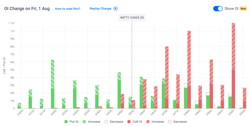The maximum Call Open Interest (OI) is observed at 25,000, followed closely by 24,800, suggesting strong resistance at 24,700 - 24,800 levels.