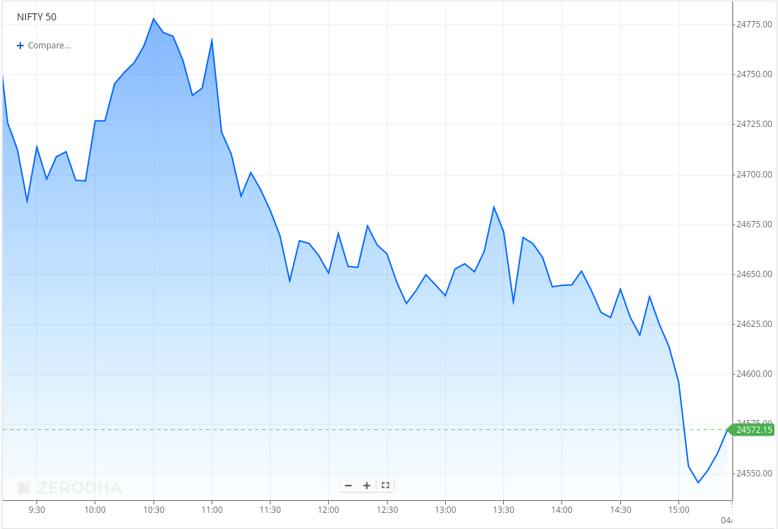 Nifty opened with a mild gap-down at 24,735 and briefly recovered to hit a high of 24,785 in the morning session. However, the rebound was short-lived, and the index steadily declined through the afternoon, touching an intraday low of 24,535. It eventually settled at 24,565, down 203 points or 0.82%, marking its fifth consecutive weekly decline.