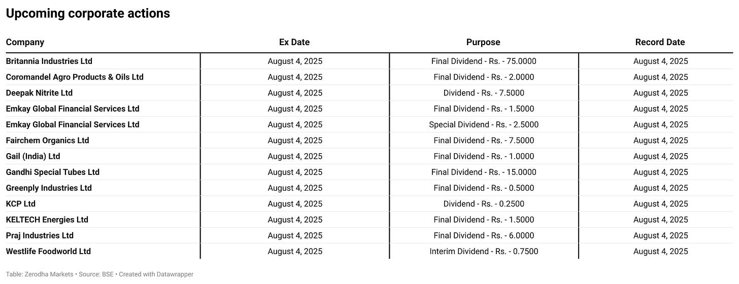 Reliance Industries will hold its 48th AGM on August 29 and has set August 14 as the record date for the ₹5.50 final dividend. Q1FY26 net profit surged 78% YoY to ₹26,994 crore, aided by a one-time gain from its Asian Paints stake sale. Revenue rose 5.3% to ₹2,48,660 crore. Dive deeper