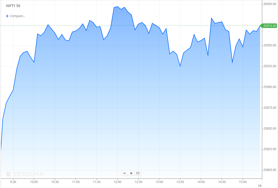 Nifty opened with a 48-point gap-up at 25,843, supported by positive global cues and firm sentiment in domestic equities. After a strong start, the index extended gains, crossing the 25,950 mark in the first hour. Through the mid-session, Nifty largely held on to its gains, trading in a narrow band between 25,930 and 25,970, reflecting resilience despite bouts of profit-taking.