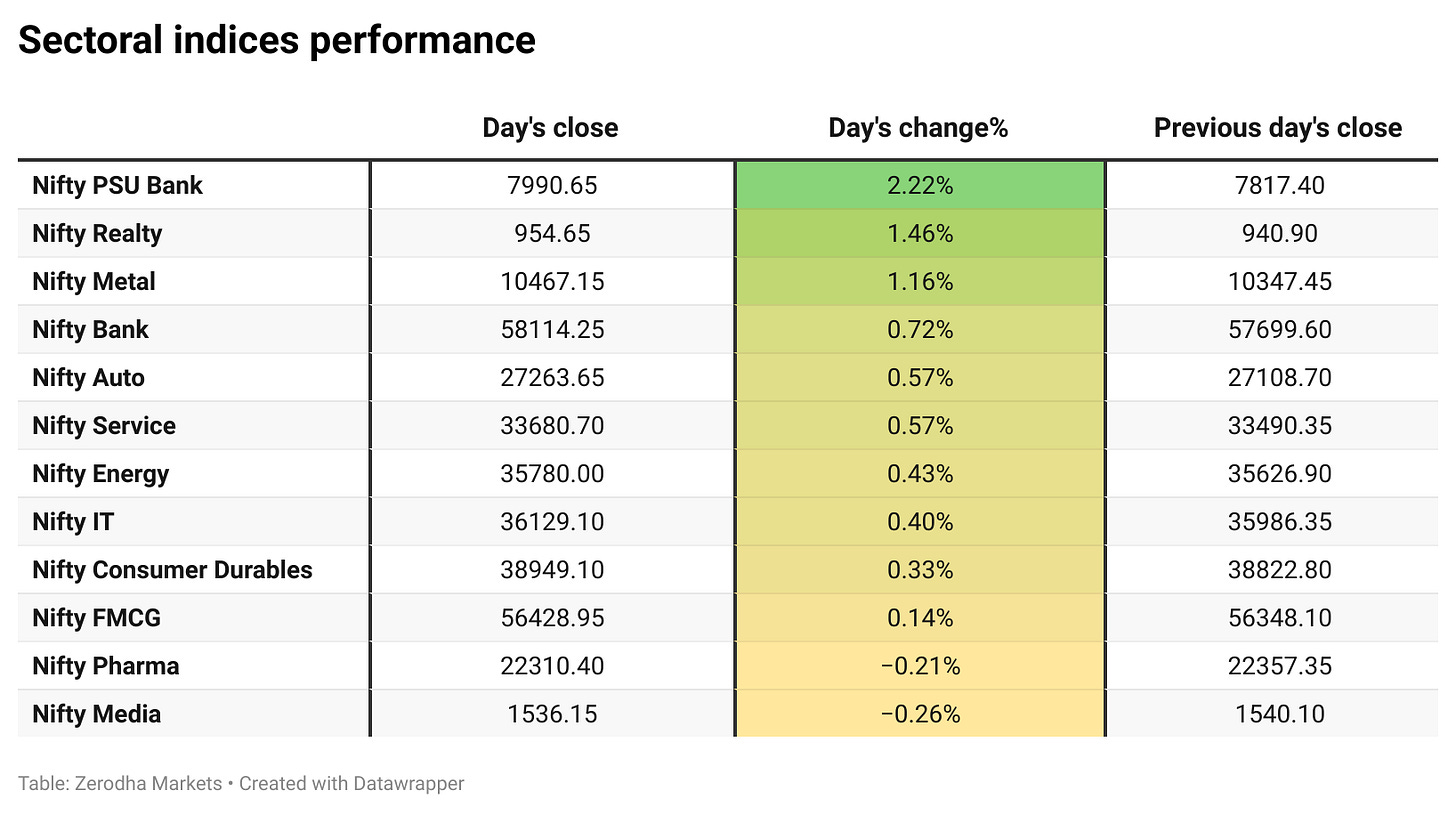 Nifty PSU Bank was the top gainer, rising 2.22%, while Nifty Media was the biggest loser, slipping 0.26%. Out of the 12 sectoral indices, 10 closed in the green and 2 ended in the red, reflecting broad-based strength across the market.