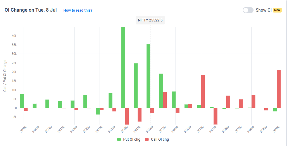 The maximum Put Open Interest (OI) addition is observed at 25,400, followed closely by 25,500, suggesting strong support around 25,400 to 25,500 levels.