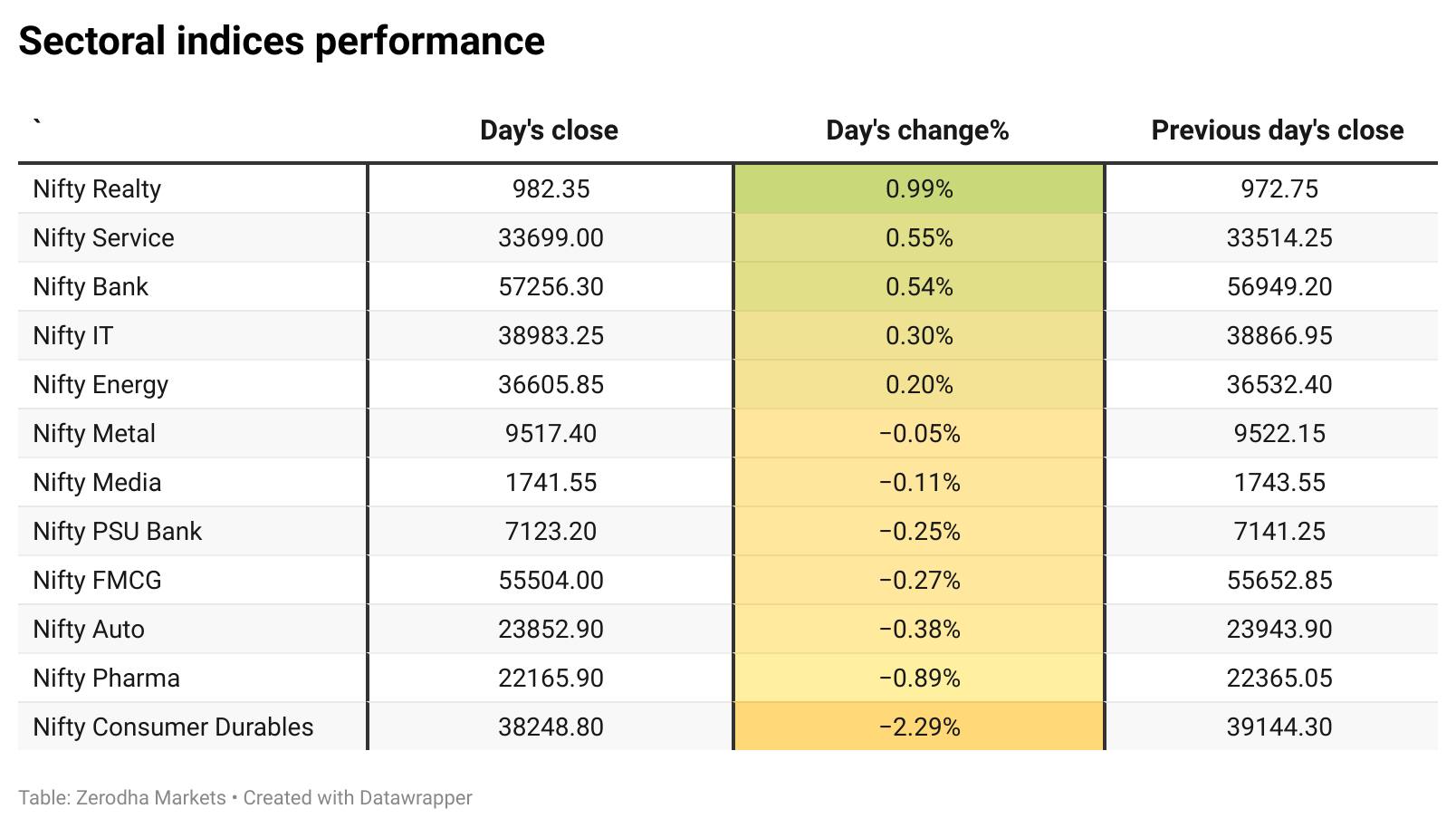 Nifty Realty outperformed, gaining 0.99%, followed by Services up 0.55% and Bank up 0.54%. IT and Energy also closed in the green with modest gains.