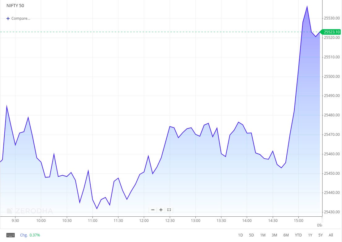 Nifty opened slightly lower at 25,427.85 and rose to 25,494.70 in the opening hour. It traded sideways thereafter, hitting an intraday low of 25,430. In the final hour, the index surged to a high of 25,547.40 and closed near the high at 25,522.50, up 0.24%.
