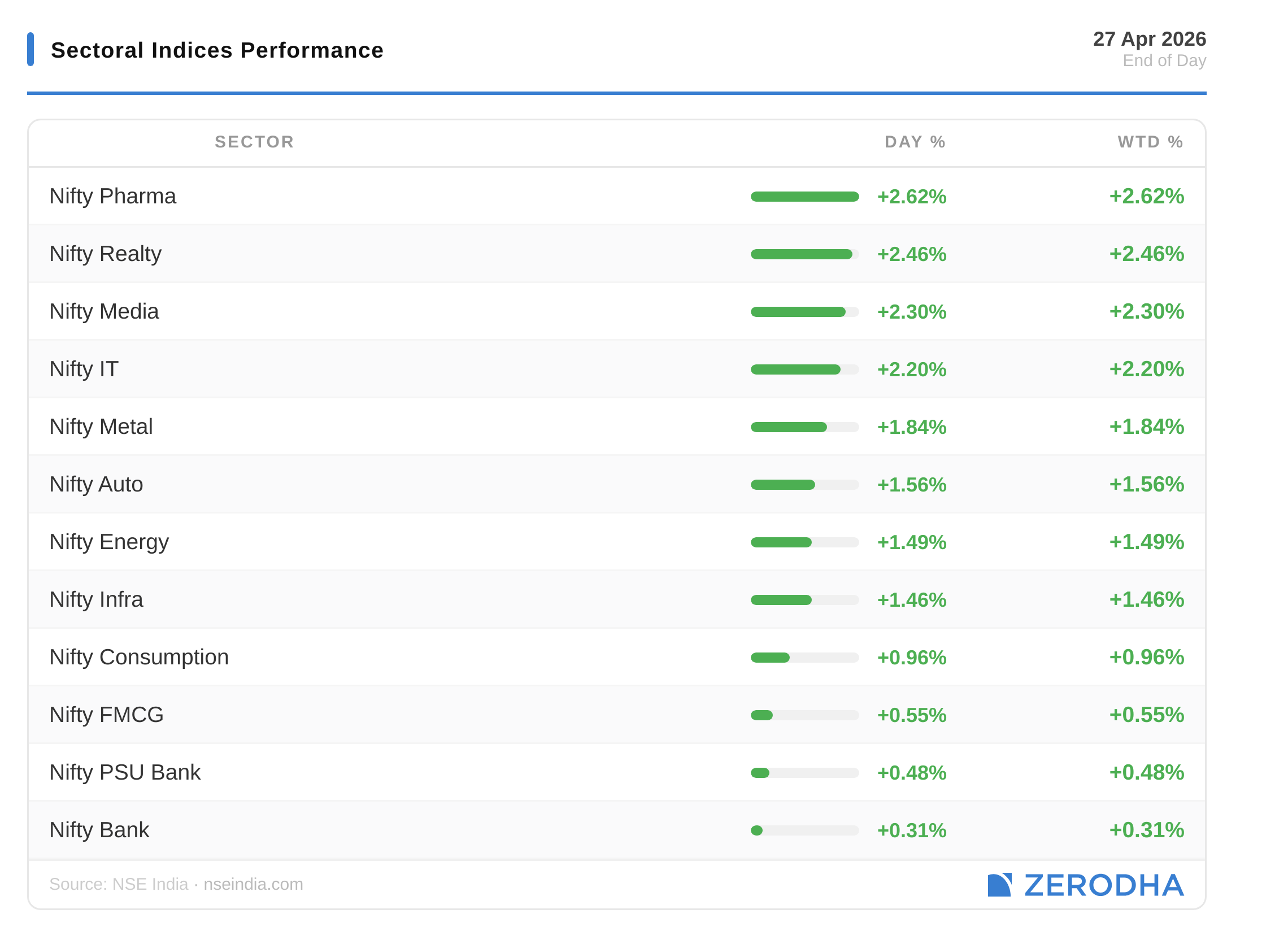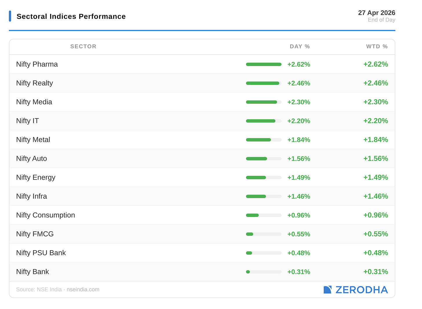 Pharma led at 2.62%, followed by Realty at 2.46%, Media at 2.3%, and IT at 2.2%. All 12 sectors closed green. FMCG brought up the rear at 0.55%, PSU Bank at 0.48%, and private banks barely moved at 0.31%.