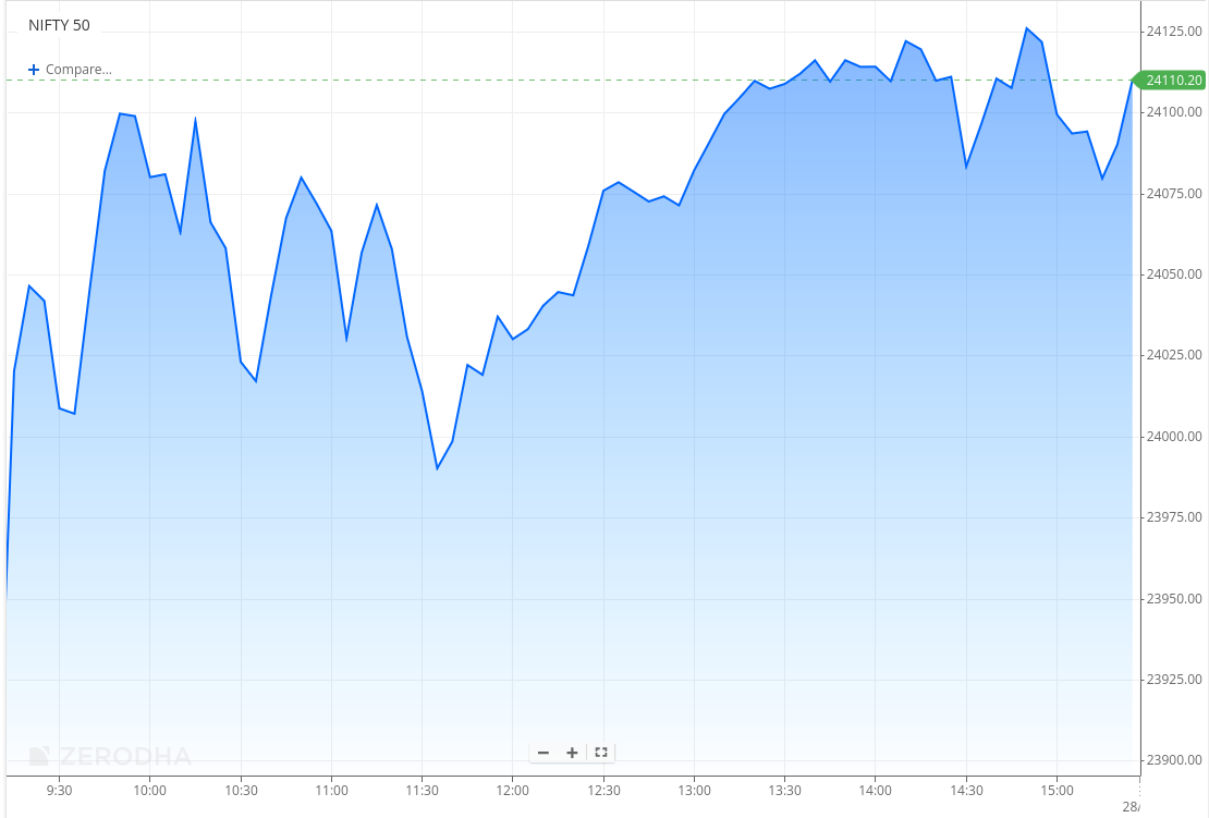 In the second half, buying interest gradually picked up, helping the index move higher in a steady uptrend. Nifty crossed the 24,050 mark post 12:30 PM and extended gains toward the 24,100–24,120 zone.