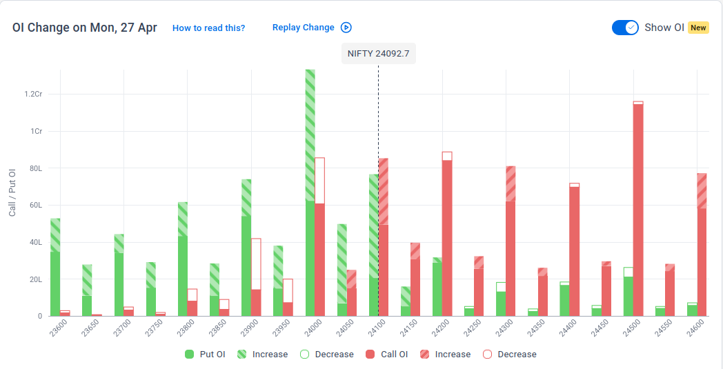 The maximum Put Open Interest (OI) is observed at 24,000, followed by 24,100 & 23,900, suggesting support at 24,000-23,900.