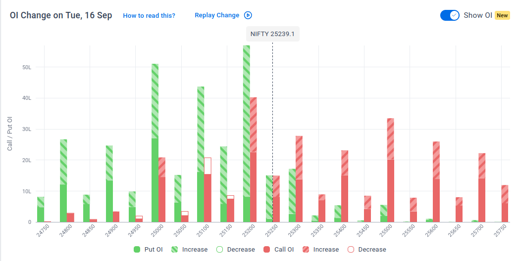 The maximum Put Open Interest (OI) is observed at 25,200, followed closely by 25,000, suggesting strong support at 25,100 to 25,000 levels.