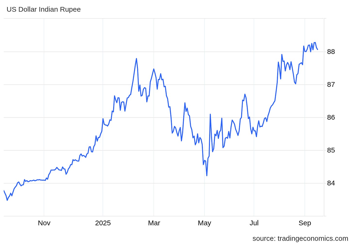 The Indian rupee stayed weaker than 88 per USD in September, hovering at record lows near 88.4 amid limited forex inflows and a dovish RBI. Dive deeper