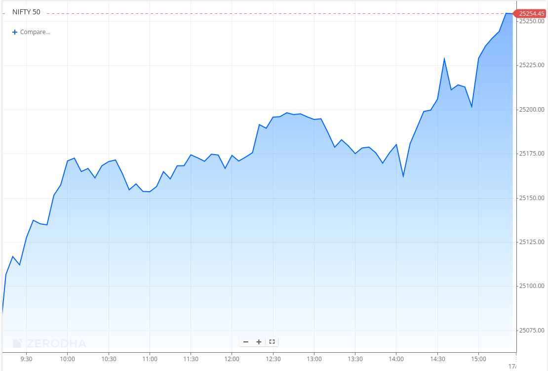 In the second half, buying momentum picked up, with Nifty advancing sharply in the final hour. The index touched an intraday high of 25,261 before closing at 25,239.10, marking a strong finish and ending well above the 25,200 mark.