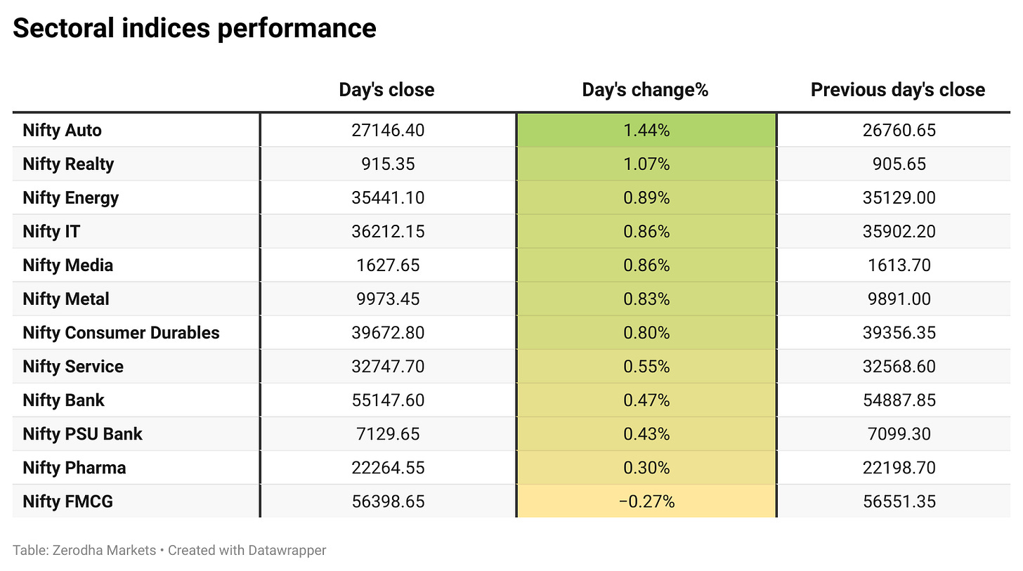 The top-gaining sector was Nifty Auto, rising 1.44%, while the top-losing sector was Nifty FMCG, slipping 0.27%. Out of the 12 tracked sectors, 11 ended in the green and only 1 closed in the red, indicating broad-based strength across the market.