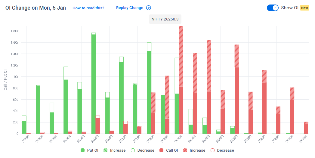The maximum Put Open Interest (OI) is observed at 26,000, followed by 26,200, suggesting support at the 26,200 to 26,100 levels.
