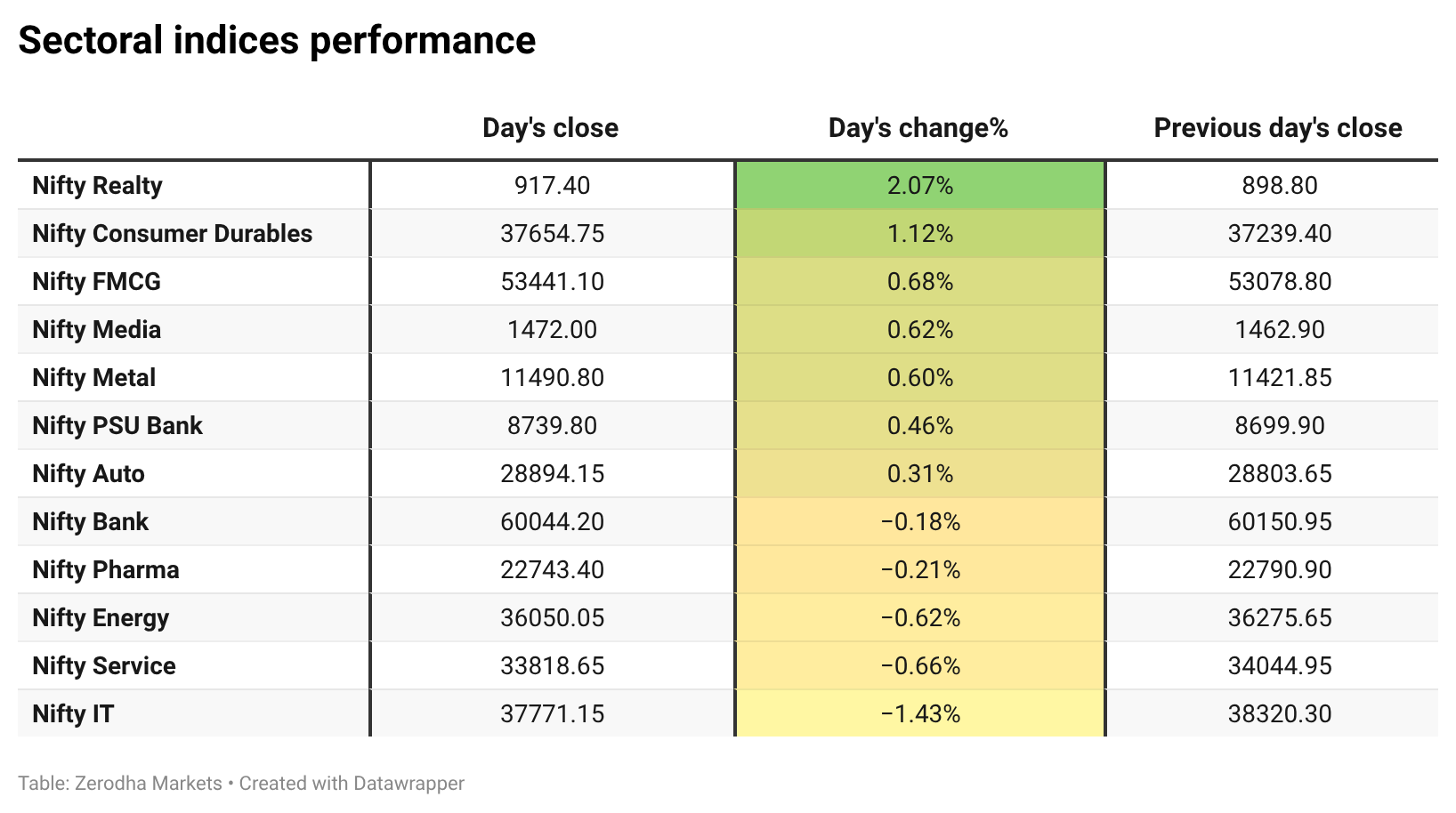 Nifty Realty was the top gainer, rising 2.07%, while Nifty IT was the biggest loser, slipping 1.43%. Out of the 12 sectoral indices, 7 ended in the green and 5 closed in the red.