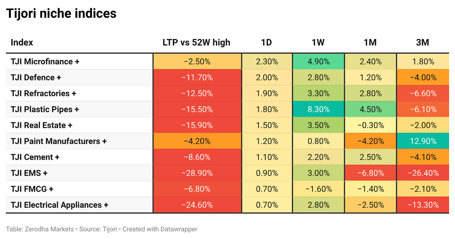 Tijori is an investment research platform that has constructed niche indices for various themes and sub-sectors. They help you understand the market performance of narrow slices of the market. You can also track the Promoter buying and other interesting stuff, like Capex activity by the companies in the Tijori App’s idea dashboard